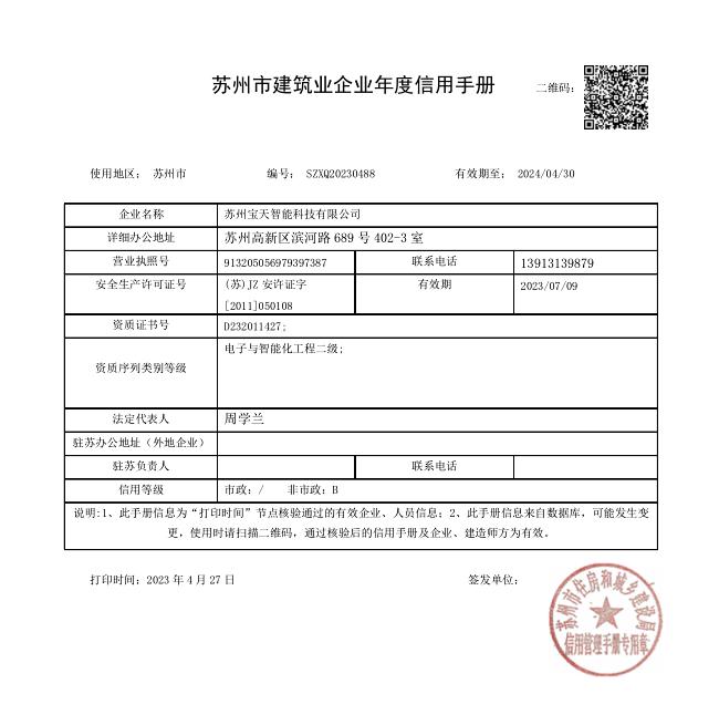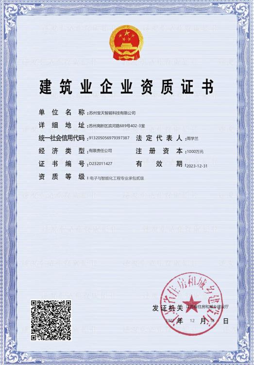 蘇州寶天智能科技有限公司,專業從事廠房、辦公智能化、信息化、安防智能化系統的實施。有數名本專業執業人員,公司實行細致的項目前期溝通、規劃,負責的項目管理、過程控制,良好友善的售后服務,多年來成功實施了眾多智能化、信息化、安防等項目。
