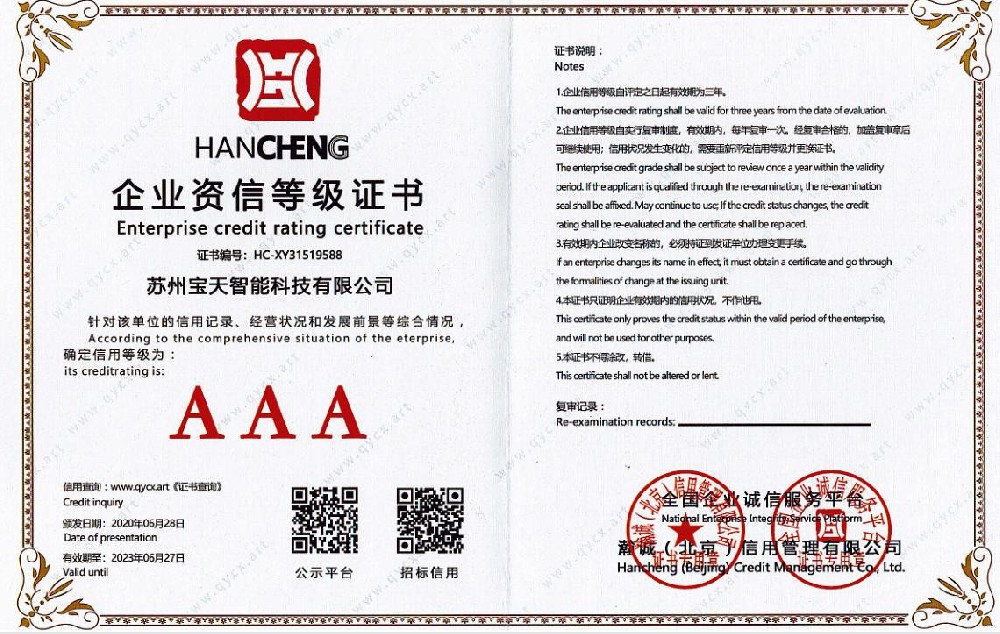 • AAA 級企業資信等級證書