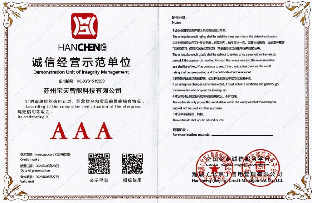 • AAA 級企業信用等級證書